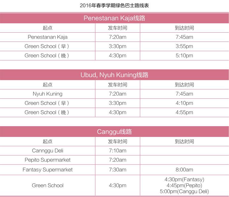-1月20日- 新学期又开始了,绿色巴士又开始了。学生、老师、实习生忙着为绿色巴士设计APP、网站、产品等。因为事情太多,所以被分成不同的小组,以加快进度。周三的课上,学生们已经准备发布绿色巴士的官方网站了。大家在爱因斯坦教室进行着各种头脑风暴,畅所欲言各自的网站主题和网页设计灵感,敲击键盘声也不绝于耳。 与此同时,我们还在忙着迄今最激动人心的项目:交换计划。也就是与本地居民、外资酒店、风景区、饭店结成伙伴关系,用绿色清洗液(也是用二手油生产的)来交换它们使用过的食用油。 2016年春季学期,绿色巴士有3条线路,(时刻表如下)。 -1月28日- 本周我们的网站已经有了域名和主机。网页在制作中,几周内能看到。我们正在与香港科技大学的团队一起开发绿色巴士的APP。它能提升我们的绿色巴士的服务水平,也有利于我们收集使用过的食用油。 我们还在与“酷酷纽带”项目合作,一起努力把思邦村(Sibang)变成巴厘岛最绿色的村子。 -2月3日- 通过实验新的原料,绿色清洗液的配方越来越多,最后希望能做成块状的肥皂。 今天,我们实施了二手油的交换计划。Ubud镇的6家餐馆加入我们的计划,用使用过的食用油交换清洗液。我们将给这些餐馆一个证书,表明他们对绿色交通的支持。他们也可以选择,在绿色巴士里用小旗子做广告。 绿色巴士的网站很快就要完成了。学生们在实际工作中学到了很多:图形设计、编写代码、写作、网络知识、展示信息等等。 -2月16日- 2月11日和12日,我们代表绿色学校参加了2016年巴厘岛清洁能源论坛,“拜拜,塑料袋”的两个姐妹也去了,我们共用一个展位。这个论坛是个国际性的论坛。 很激动,绿色巴士的乘客达到了350人,空前的高。相信以后还会更高。这是我们第三辆巴士投入使用后取得的成绩。 -4月13日- 绿色巴士这个社会企业运行整整一年了。前几天,推出了多种块状肥皂的样品。 -5月12日- 今天,我们不是1组,而是2组去收集二手油。一组去赛奴尔(sanur),一组去长古(canggu)。共收集了288升。不少吧。 但是,上周我们共花了72个小时收集,这是个新纪录,共收集400多升。我们自己都对这个成绩很吃惊。 昨天,又有20多人加入了绿色巴士公司。感谢欧德曼斯餐馆(Old Man's),过去2周捐献了300升使用过的食用油。300升足够我们的一辆绿色巴士跑至少一个月。 我们的杰瑞罐很充裕。 -5月27日- 前天,我们去了长古村,30个人,乘坐2辆车,回收了228升二手油。 昨天,为了准备5月28日的演讲,有人不断地练习演讲词,其他团队成员则辛苦地为制作的300瓶清洗液装瓶、清洁、贴标签。 今天,我们在学校停车场举办了“巴厘岛最绿色洗车”活动,用的是自己生产的清洗液,洗车的水不是随意流走,而是用来灌溉草坪。每辆汽车的清洗价格是50000卢比(约合人民币25元),摩托车是20000卢比。 我们明天要到农贸市场去销售绿色巴士的T恤衫,并分发更多的杰瑞罐。 回头看看,真是沧海桑田啊。当初,仅仅是几个学生为了得到科学课的学分,去制作清洗液。如今,绿色巴士发展成一个持续运营的公司,五脏俱全。一开始,我们只是偶然有时间卖卖清洗液,现在是能够有组织地在岛上不同的农贸市场销售多种产品。从只有1辆公交车,到现在的3辆。从无人知晓,到现在Earth Hour、TED等很多机构邀请我们去参加活动、演讲。 -6月2日- 前不久,凯尔老师(Kyle)的绿色数学班(green math class)上的学生科洛夫、玛雅和索菲去参加了一个5分钟左右的创业项目的比赛。他们展示的内容就是如何用二手食用油来生产环保清洗液。 结果,这个项目很被看好,赢得了一笔风险资本外加创业指导。接下来,他们要完善清洗液产品、批量化生产,以及制订营销计划、设计包装和品牌、批量销售。 于是,凯尔老师就向帕克·戴夫(Pak Dave)发出邀请,让他来担任教练,对学生进行创业和商业指导。帕克·戴夫和他的妻子、也是合伙人的莎拉,一直都是创业家。他们创办了几家兴旺的企业,并在加拿大著名的风险投资类节目《龙潭虎穴》担任创业教练。 没想到,戴夫真的接受了邀请,来到了绿色学校。现在,他的两个孩子分别在绿色学校读4年级和6年级。 “让我们决心来绿色学校的一个原因就是这里的创业背景。很多孩子的家长都有创业的经验,对创业感兴趣的孩子也非常多。创业热情是很多家庭的共同特征。”戴夫说,“我会全身心地投入到工作中,如果某个孩子心中藏着创业家的火苗,我能够让它熊熊燃烧。” 戴夫特别欣赏凯尔老师的绿色数学班,“与班上的任何孩子交谈,都是非常奇特的,孩子们都非常喜欢这个班。许多孩子都尝试着做出自己的产品”。 戴夫老师正在做一本手册,介绍创业的思维方式和基础的商业实践。他的公司每年雇佣250名15到25岁的年轻人,主要从事销售工作。给这些年轻人提供指导是他在商业中最喜欢的事情。 期末了,马上就要放暑假了。希望戴夫老师2016-2017学年能在绿色学校待更长的时间! 项目3:T恤衫Nalu 与梅拉蒂和伊莎贝尔姐妹一样,今年15岁的达莉(Dali)和12岁的芬因(Finn)姐弟也是约翰和绿色学校的骄傲,他们也有着特别的故事。 先听听姐姐达莉的自述吧—— 2011年,我和家人到印度旅游,到了炎热、灰尘很大的印度中部。我父母作为志愿者,去那里的学校担任按摩治疗师,于是我在操场上交上了一些朋友。我们一家特别喜欢这个地方,每年都会过去